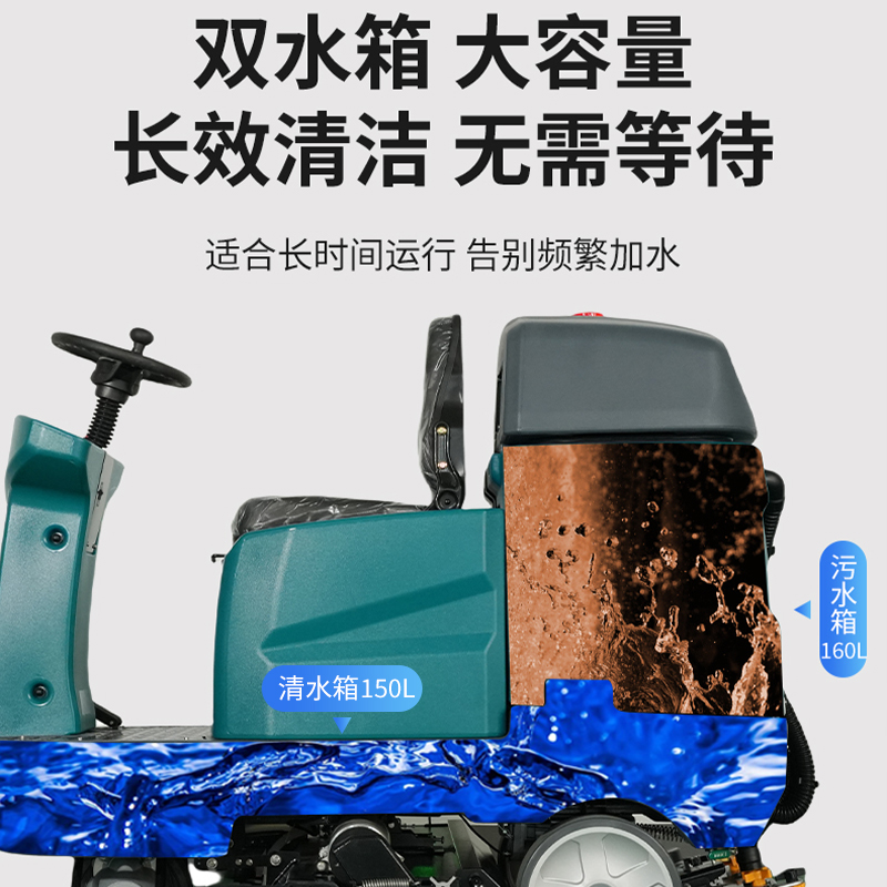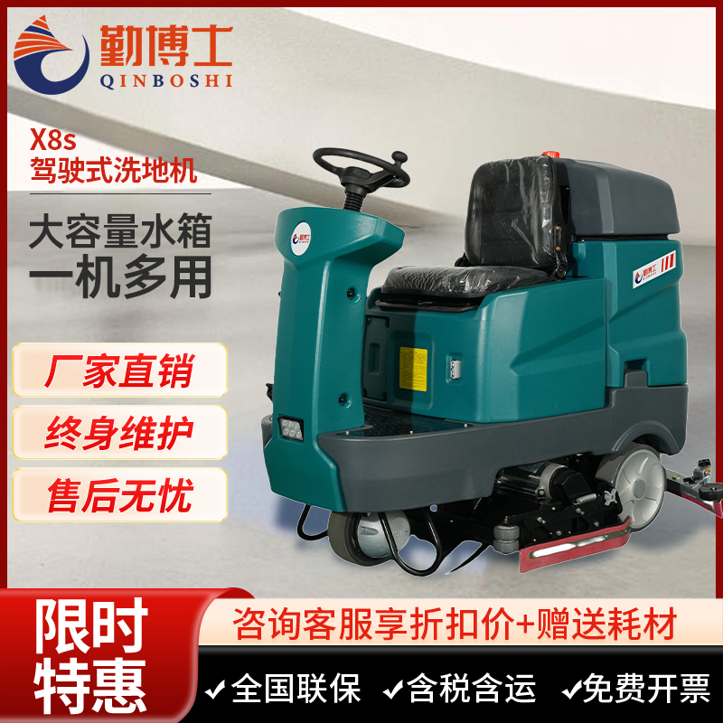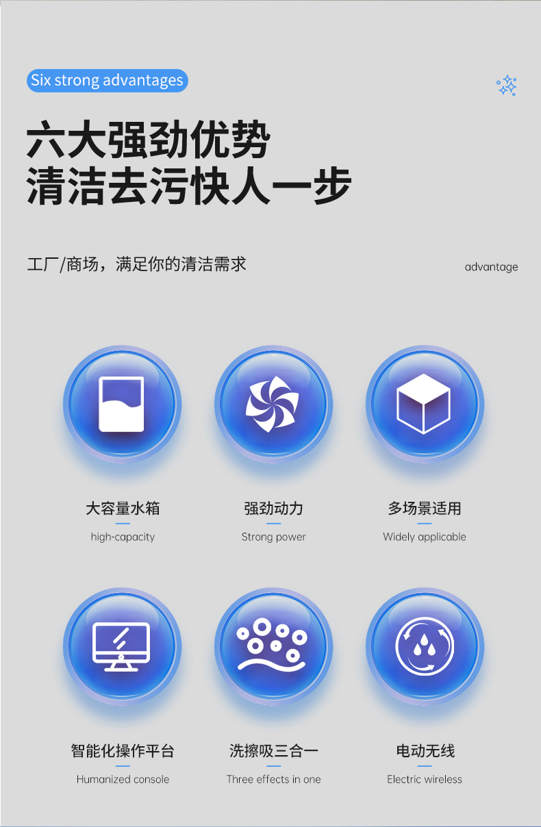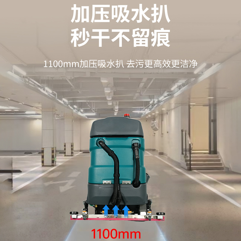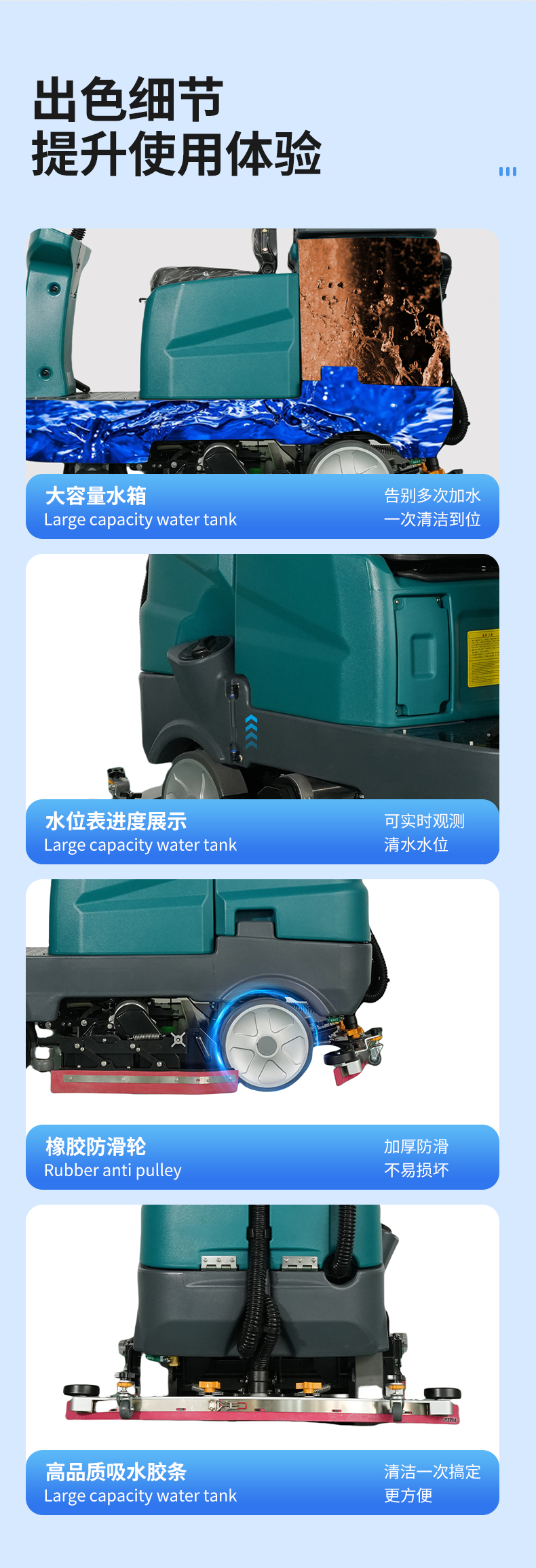 QBS-X8G的产品性能: 拥有多挡可调节对地压力,可适应多种地面; 一键吸水扒刷盘提升采用电动推杆驱动,操作更简单; 知名品牌前驱电机+防滑胎皮,抓地力强; 采用前后连通式底盘设计,机器行驶更稳定; 800mm双滚刷,集尘清洁效果更好; 转向系统采用齿盘链条啮合传动,转向更灵活;